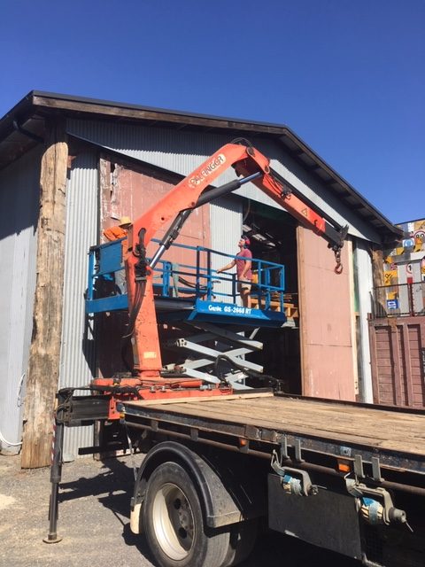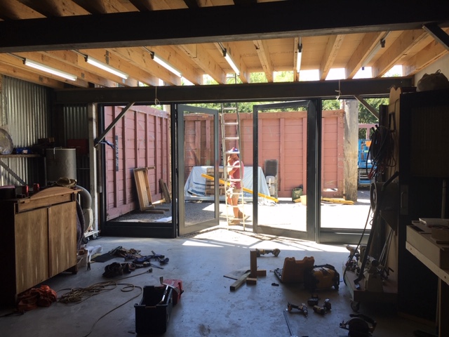As a lot of folk know… we live in the back skillion part of our shed as caretakers. Behind us is the gabled section of the shed, which has a slab base, and houses our workshop tenants.. Phil the Luthier, and Sam the cabinet maker. The north and south ends of this workshop are clad with huge 6m high roller doors, that are ex Melbourne Wharf. We need a little extra space to move up there with 2 teenagers and their ever expanding array of friends (as we sleep in the lounge room)… so we are pushing through into the top of Phil’s workshop.