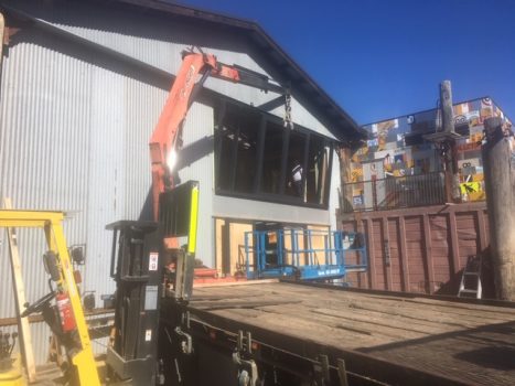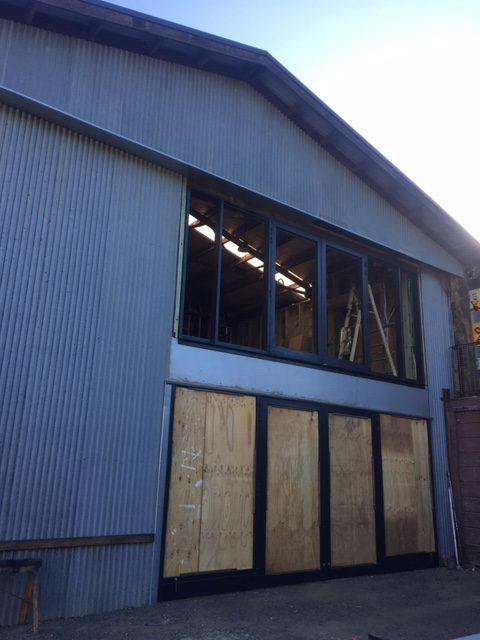 Phil and ourselves will benefit from the magnificent work of ‘Team Glennie’ as the huge Wharf doors (and therefore Phil’s shoulder injuries opening and closing them every day and night!) will ‘disappear’ (read, go out into the world to hopefully some new home in another very gorgeous barn)… to be replaced by the skilled steel construction work of these two super gents, as they have built steel frames customised to all open spaces, which will, in turn, be glazed by… yep… you guessed it… ex commercial glass, which just happens to be conveniently located not 400m away!