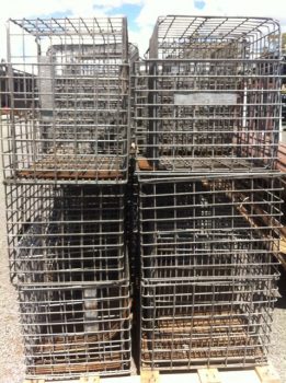 Galvanised baskets that were used originally for glass factory output…. and then saw their second incarnation as a major shelving unit in a large melbourne warehouse…. then found their way to the salvage yard! We have found many uses for them down here… and we love it when we see them pop up everywhere in local businesses as well! $45 each.