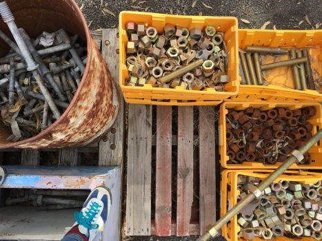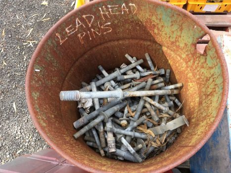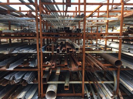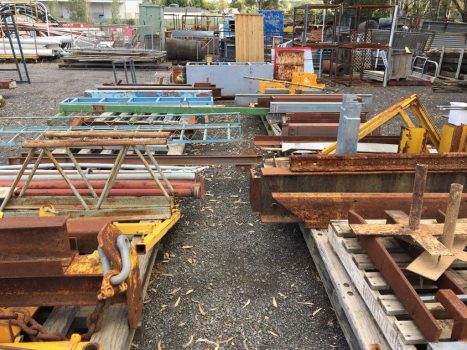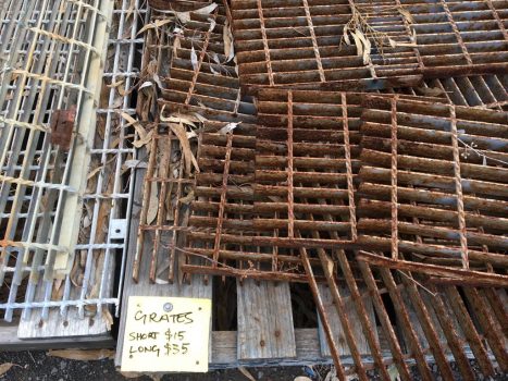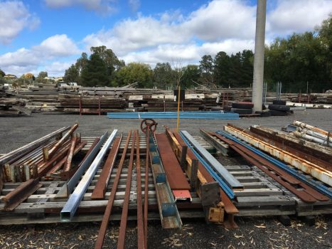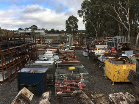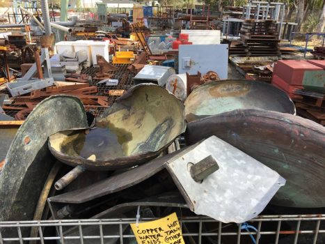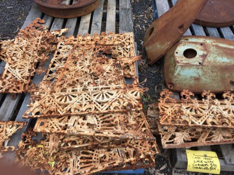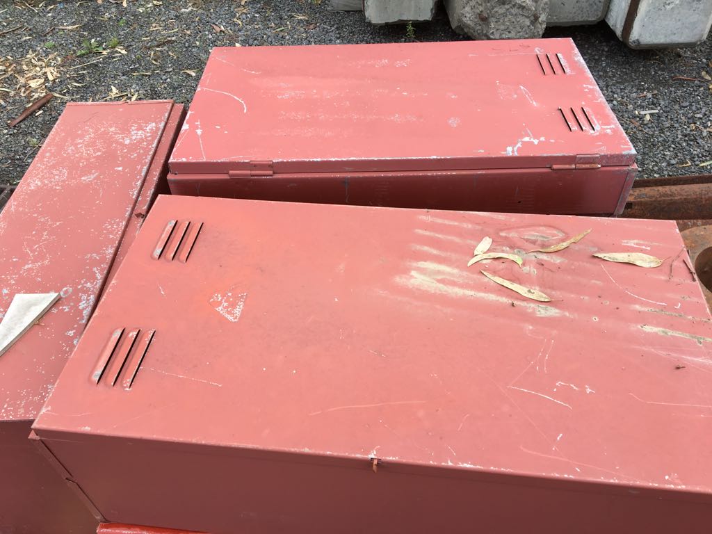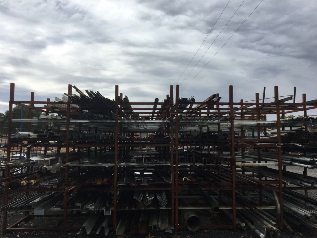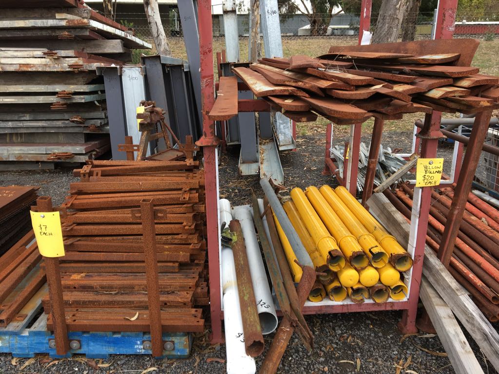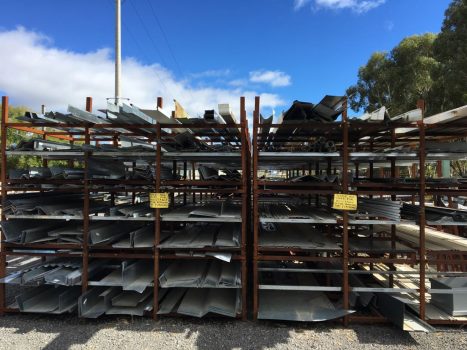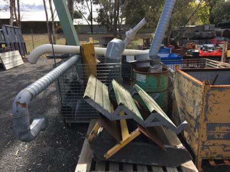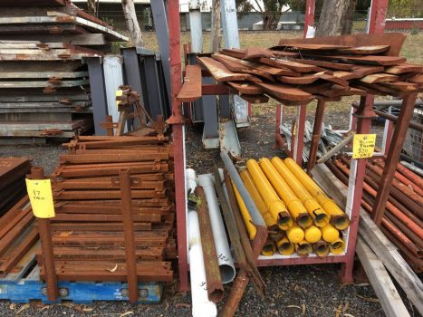 In the back section of our yard is where you will find all of our steel miscellany… the steel racks hold plenty of roofing leftovers… top hat battening, strips of 3mm flat bar and aluminium strapping, copper pipe and lengths of steel rod on one side… the other is our dedicated ‘flashings’ rack.  We have buckets of bolts, nuts, washers, steel trusses and cast iron legs, steps, mesh and copper. We also have a selection of old electrical meter boxes.